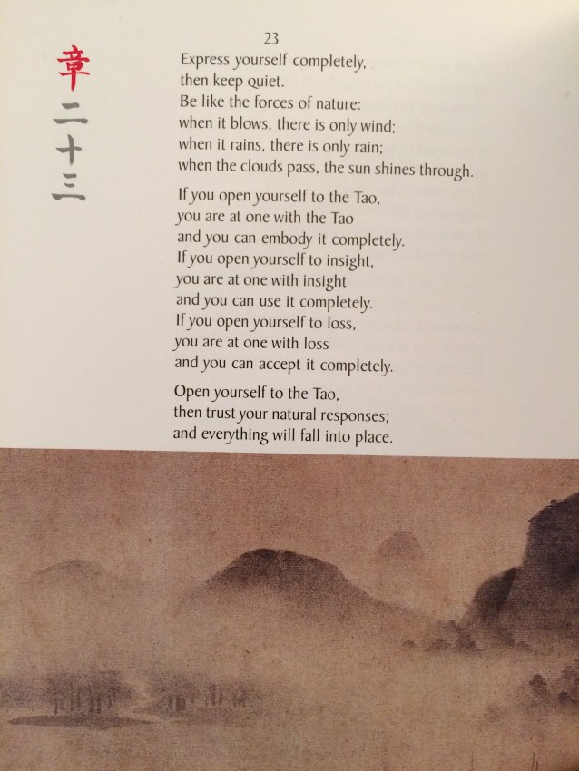 Daily Taoist – DDJ23 May 19, 2017May 19, 2017 / Tai Chi Notebook Here’s today’s piece of Taoist wisdom from the Dao Te Ching. To me, chapter 23 is speaking about being in the present moment and living naturally. Not hanging on to things once they’ve happend. What does it mean to you? Like Loading... Related