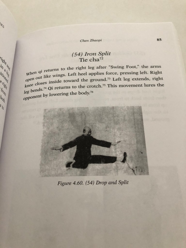 Moving on, the next chapter is by Chen Zhaopi himself and contains annotated photos of Zhaopi performing the Chen old frame first form. These photos will be of particular interest to modern day Chen practitioners as he performs many movements in quite acrobatic ways, including movement 54 called the “Iron split” where he drops to the floor in a dramatic half splits movement.