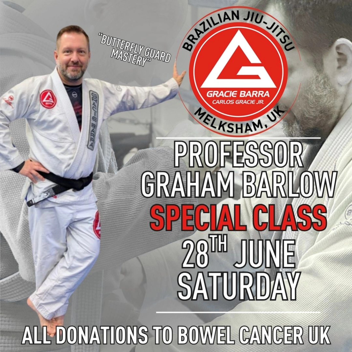 I lost my mum to bowel cancer in May this year. In her memory I’m doing a special class on one of my favourite BJJ topics, butterfly guard, to raise money for Bowel Cancer UK. It’s on 28 June at Gracie Barra Melksham, UK, 12.00pm. All welcome.