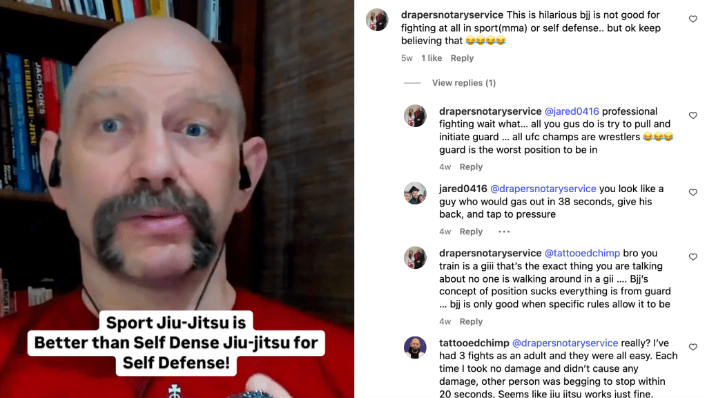“This is hilarious BJJ is not good for fighting at all in sport (MMA) or self defense.. but ok keep believing that “