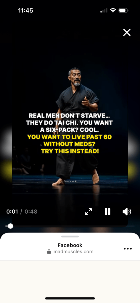 Firstly, these confident, super-tonned Chinese gentlemen, are clearly creations of generative AI video apps. Everything about the videos looks as fake to me as the idea that tai chi on its own will get you that shredded.