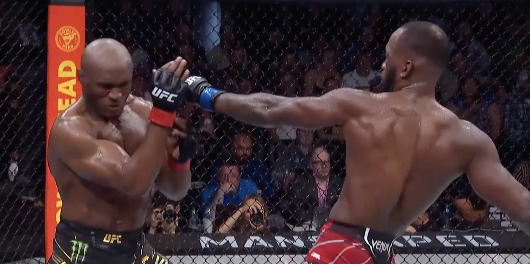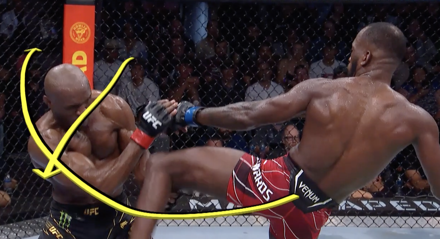 1. Feint the left.2. Usman dips his head.3. Kick connects!